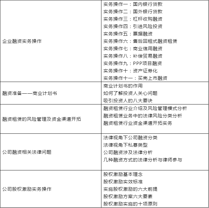 融资经理培训项目以线上线下培训相结合的形式,具体涵盖如下知识模块:(报名成功后向课程顾问索要线上课程学习链接)线上课程:线上课程包括:企业融资基础概念、融资渠道介绍、融资实务操作、股权激励实施、融资法律问题解析、商业计划书撰写、融资租赁与资金渠道开拓等主题,共计约25课时。